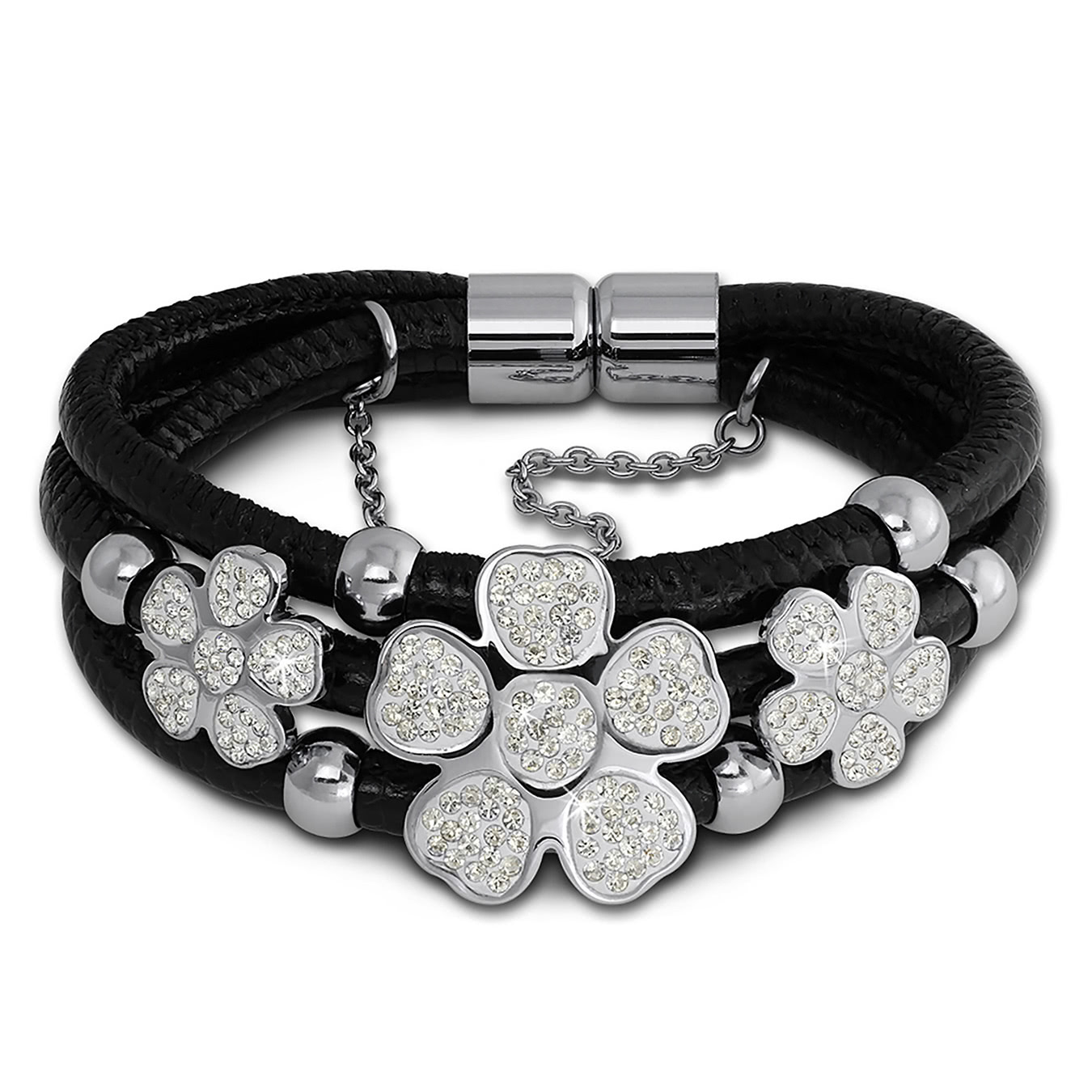 Amello Damen Armband Zirkonia Blüte Leder Edelstahl schwarz silber weiß LAQ003S1