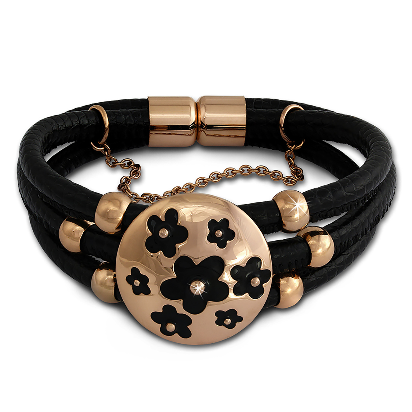 Das Produkt besteht aus Leder, Edelstahl und 333er Rosegold vergoldet (Edelstahl (Stainless Steel) und vergoldet (Roségold 333)).