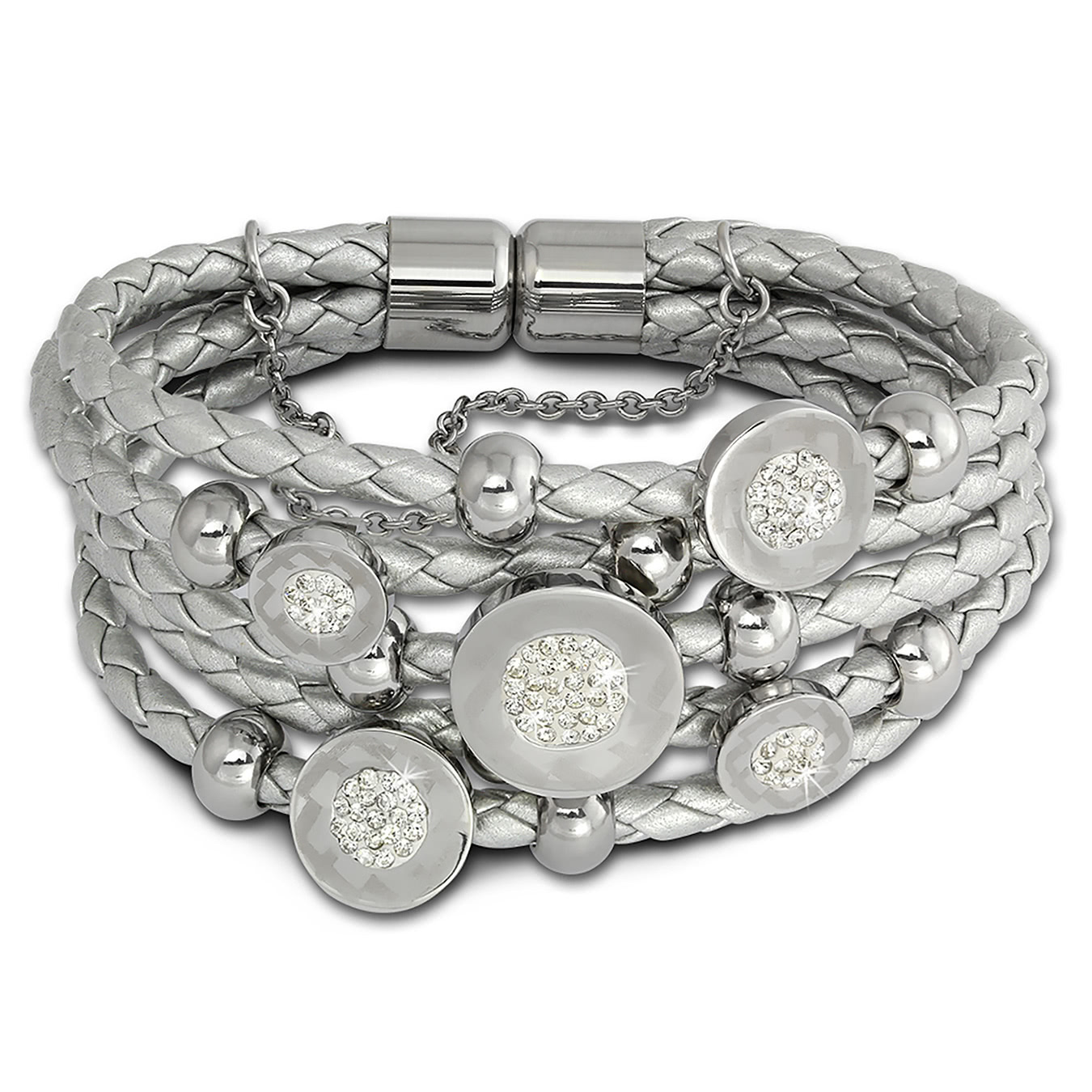 Amello Damen Armband Zirkonia Kreise Leder Edelstahl silber grau weiß LAQ013J9