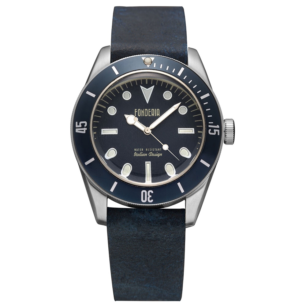 Das Gehäuse besteht aus Edelstahl und blau.