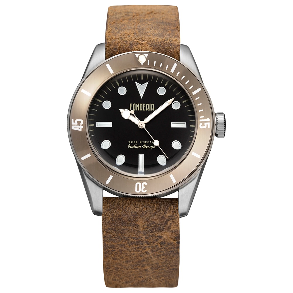 Das Gehäuse besteht aus Edelstahl und braun.
