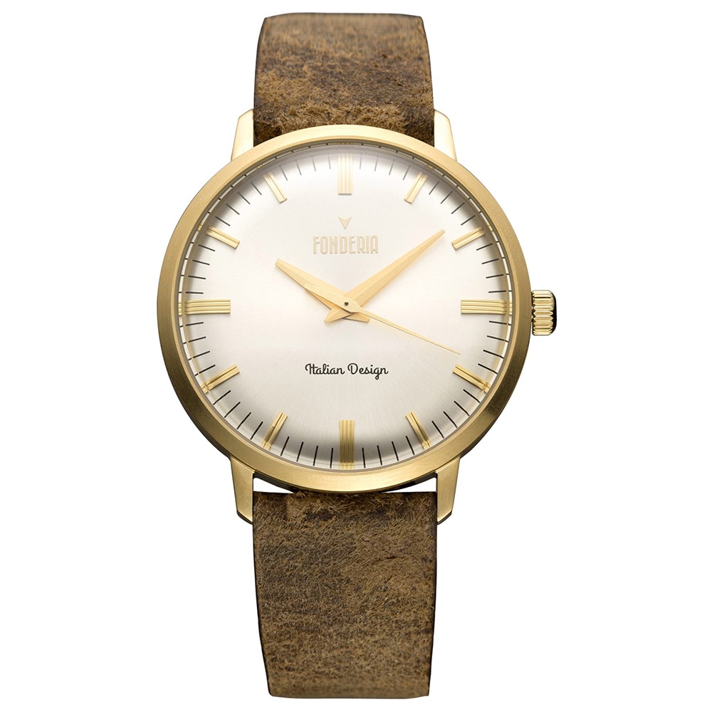Das Gehäuse besteht aus Edelstahl und ionenplattiert Gold.