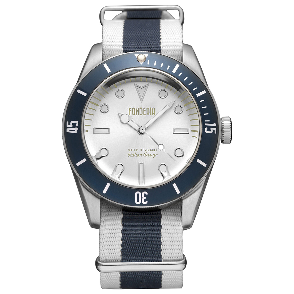 Das Gehäuse besteht aus Edelstahl und blau.