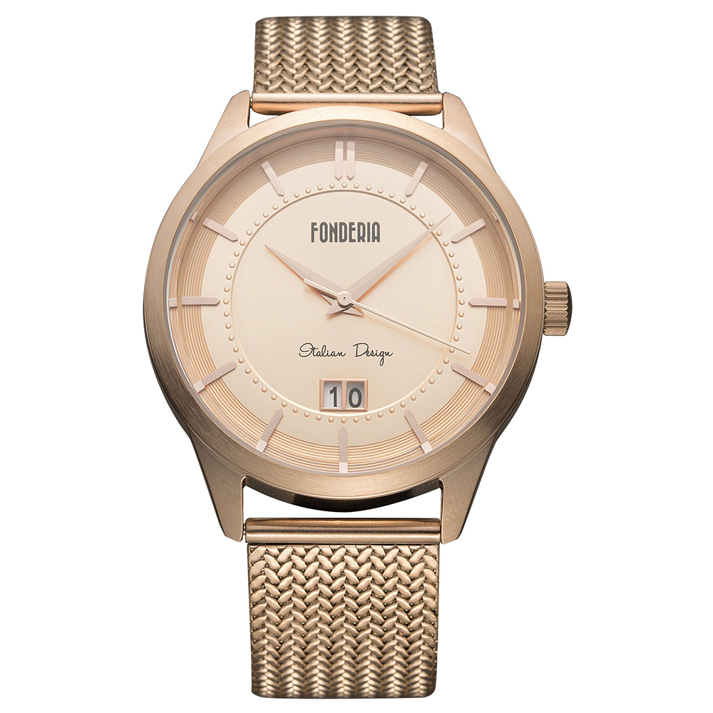 Das Gehäuse besteht aus Edelstahl und ionenplattiert Gold.