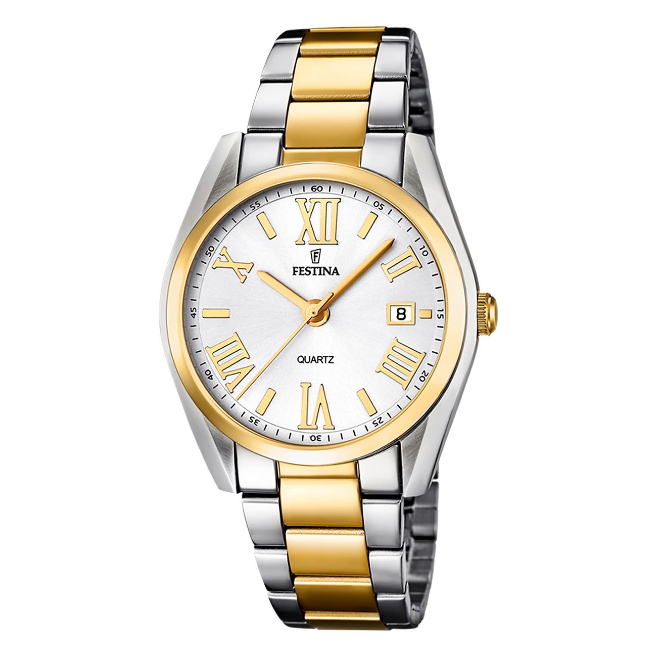 Das Gehäuse besteht aus Edelstahl und PVD Gold.